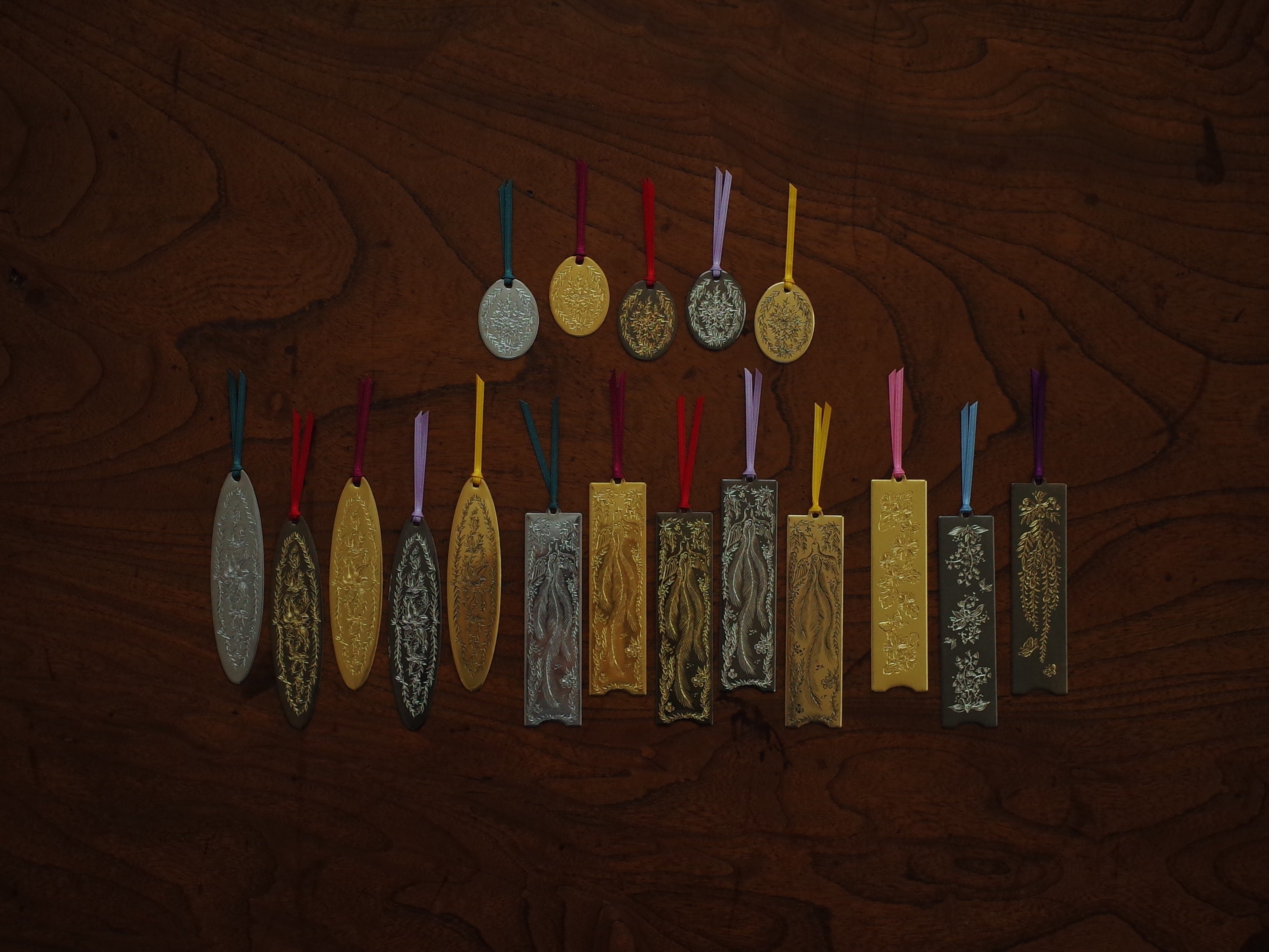 花唐草模様の彫金しおりです。 「片切り彫り」という彫金の技法で、筆で描いたような線を丁寧に彫刻しています。電鋳(エレクトロフォーミング)という方法を用い、とても薄い厚みで軽く仕上げてあります。 光の当たり方によって変化する輝きもお楽しみ下さい。 読書がより楽しく、ほんの少し特別な時間となりますように。 素材 / 銅, メッキ, 厚紙, サテンリボン サイズ / 縦38mm×横27mm×厚み約1mm(リボン含めず) ※多少の個体差がございます。(厚み、メッキの色味、プレスによる裏紙のシワ、リボン長) ☆お買い物の手引きです。ご購入前に必ずご一読ください。 https://shop.hot-rose.net/p/00001