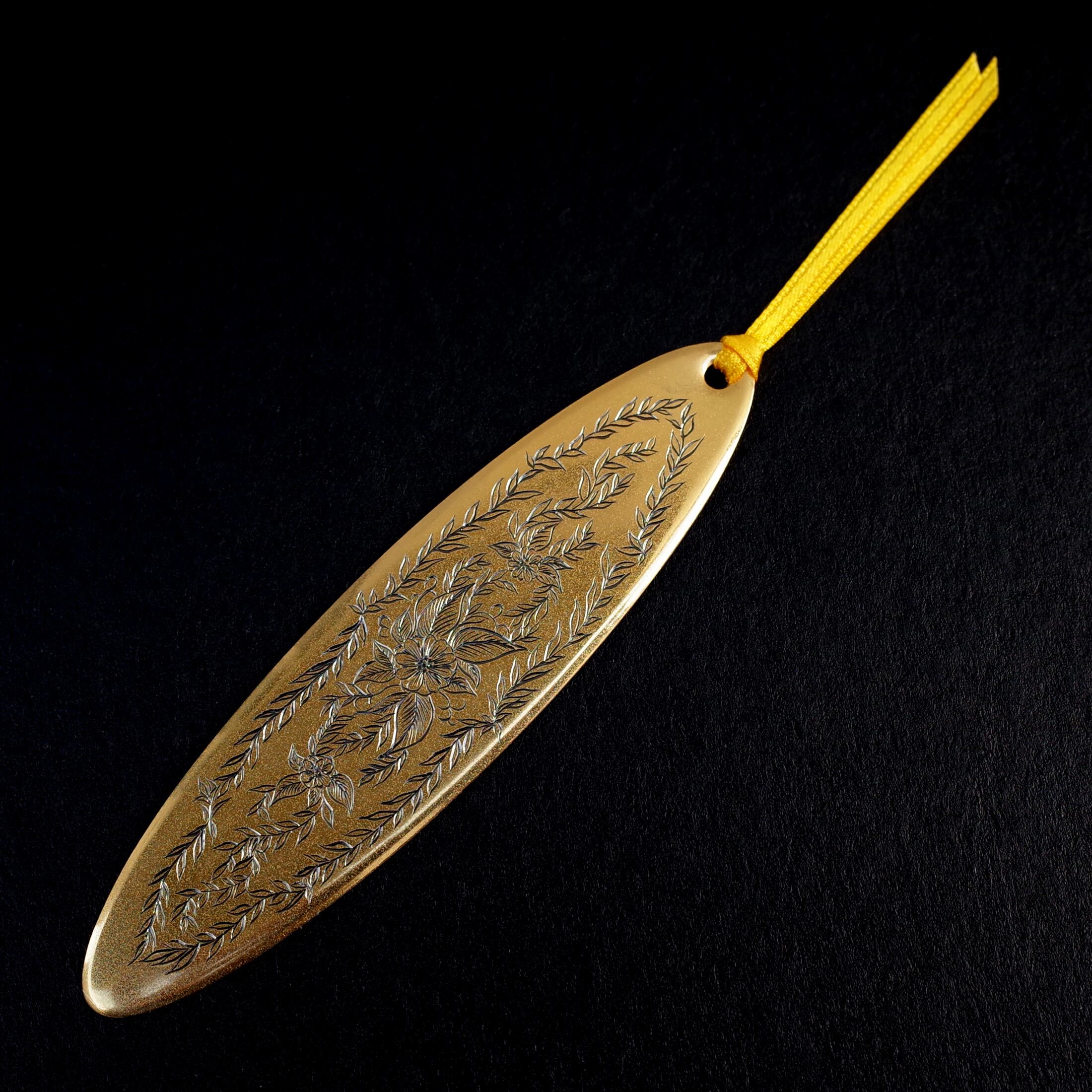 「片切り彫り」という彫金の技法で、筆で描いたような線を丁寧に彫刻しています。電鋳(エレクトロフォーミング)という方法を用い、とても薄い厚みで軽く仕上げてあります。