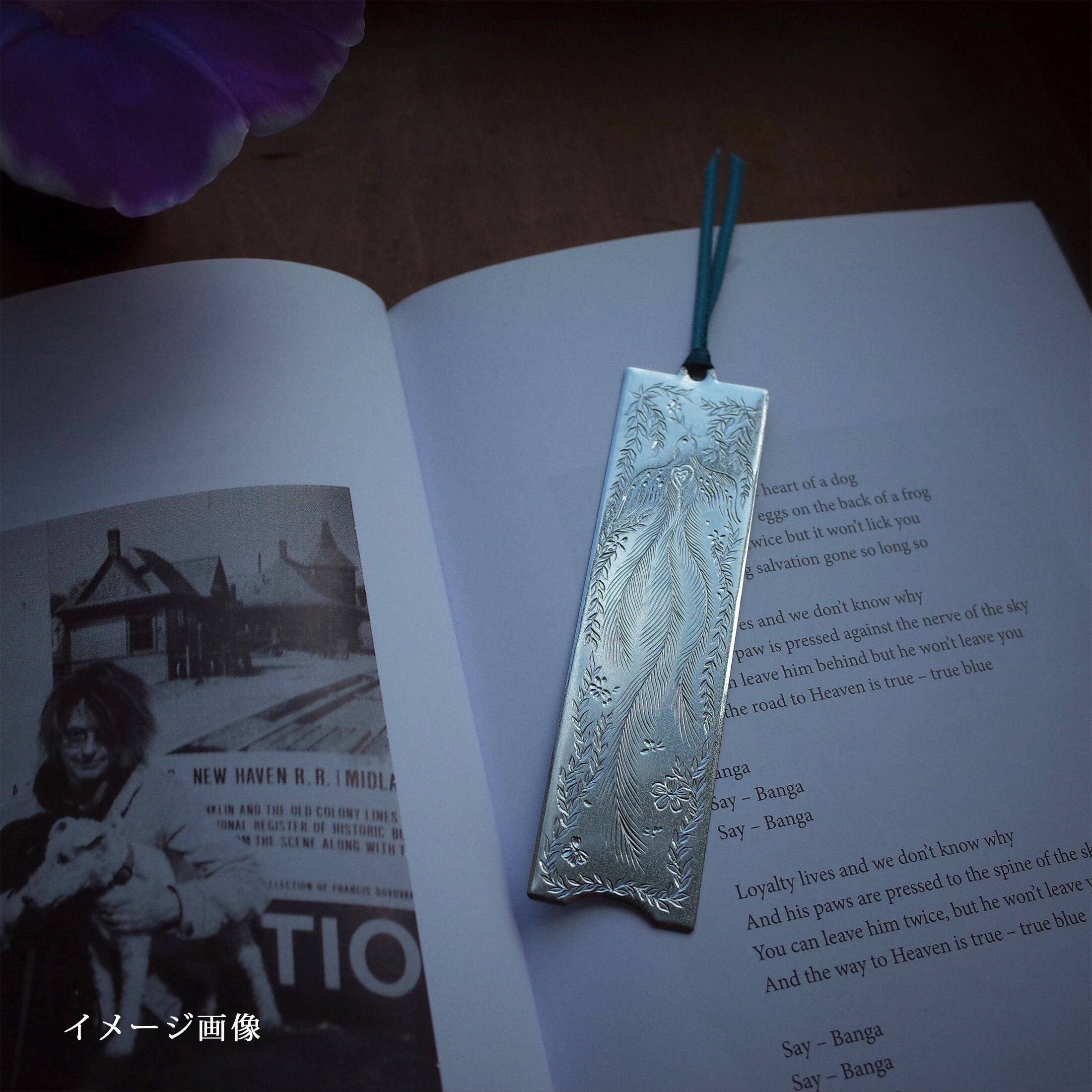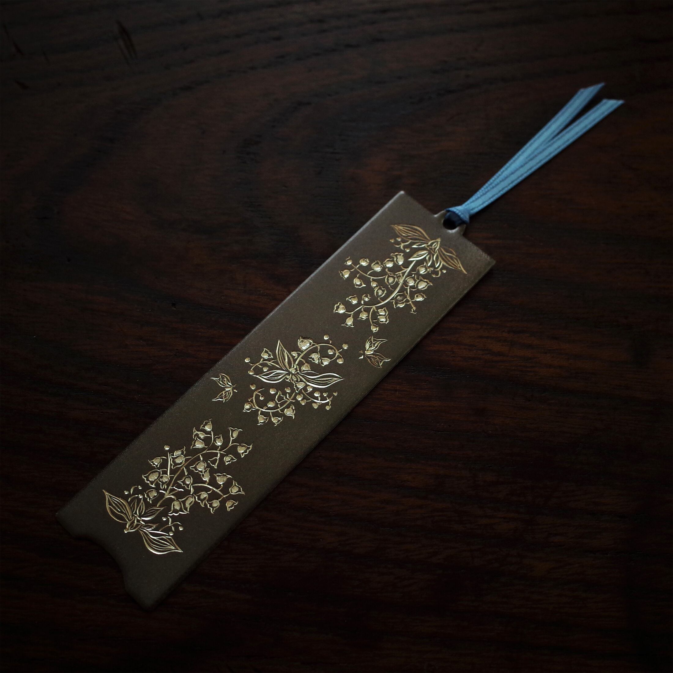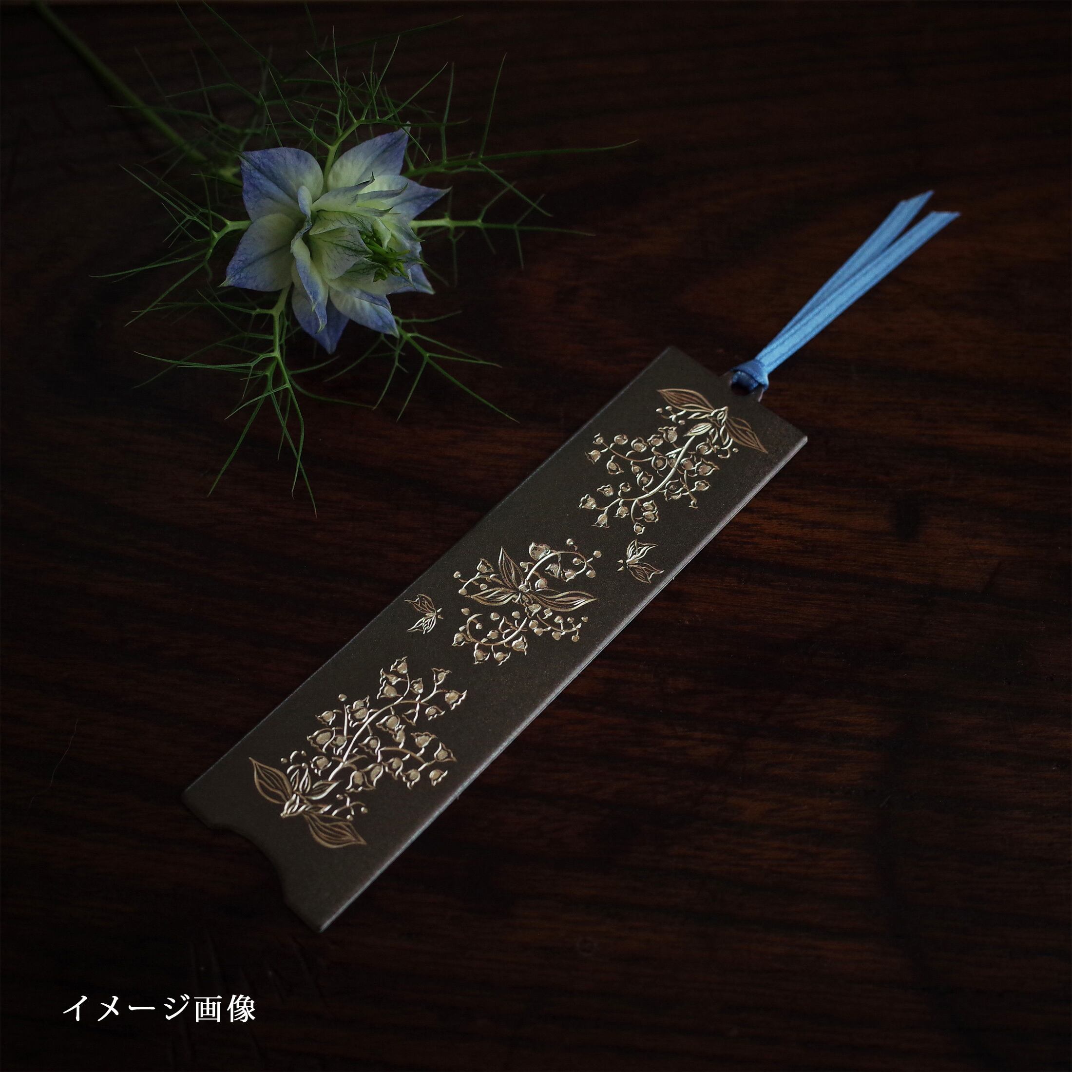 すずらんと、香りに惹き付けられ遊びに来た蝶々の絵柄の彫金しおりです。すずらんは、ヨーロッパでは春のシンボル、また幸福をもたらす花とされ、大切な人や花嫁に贈る風習があります。