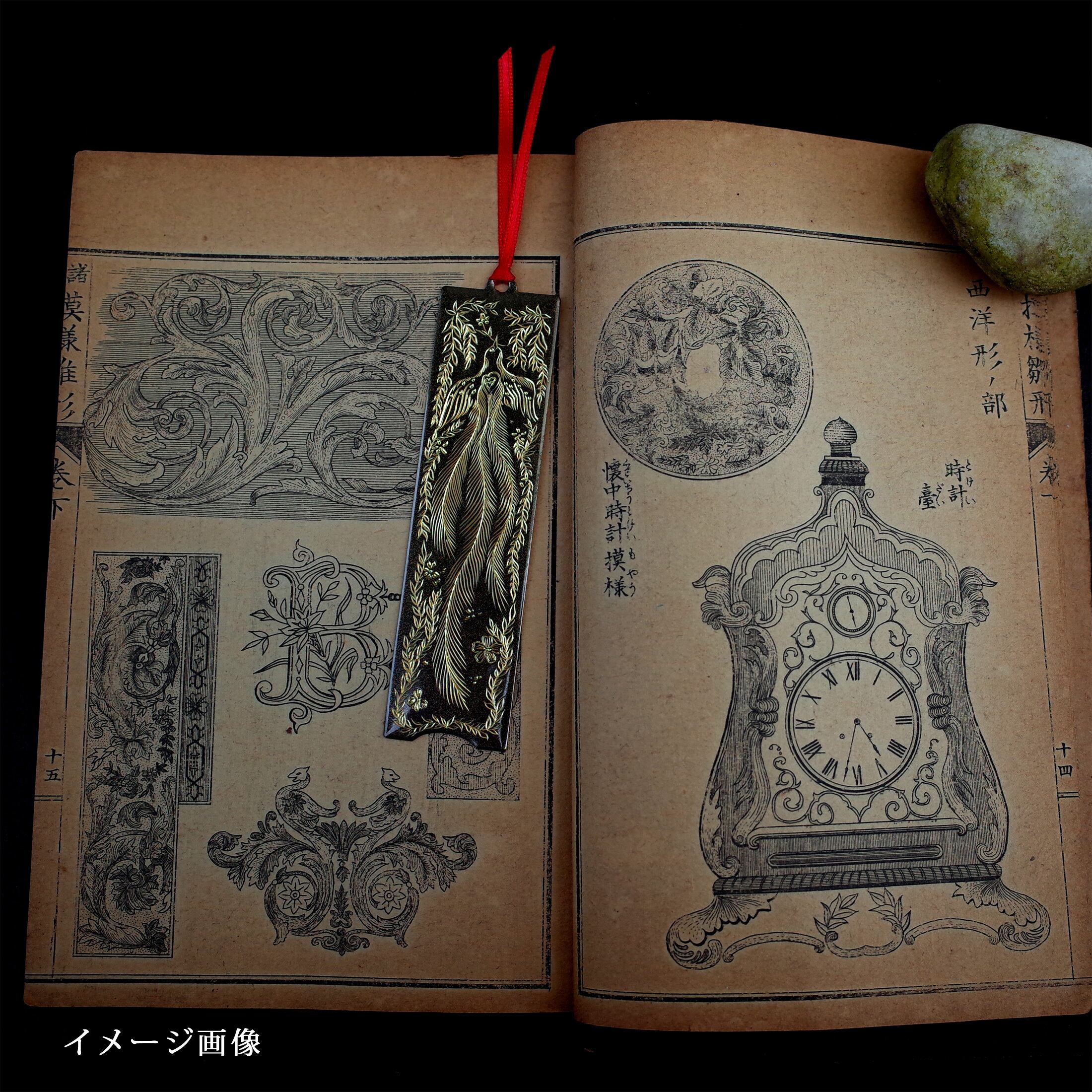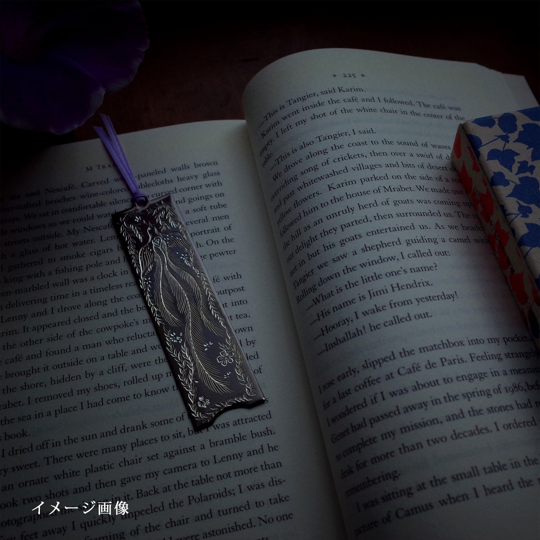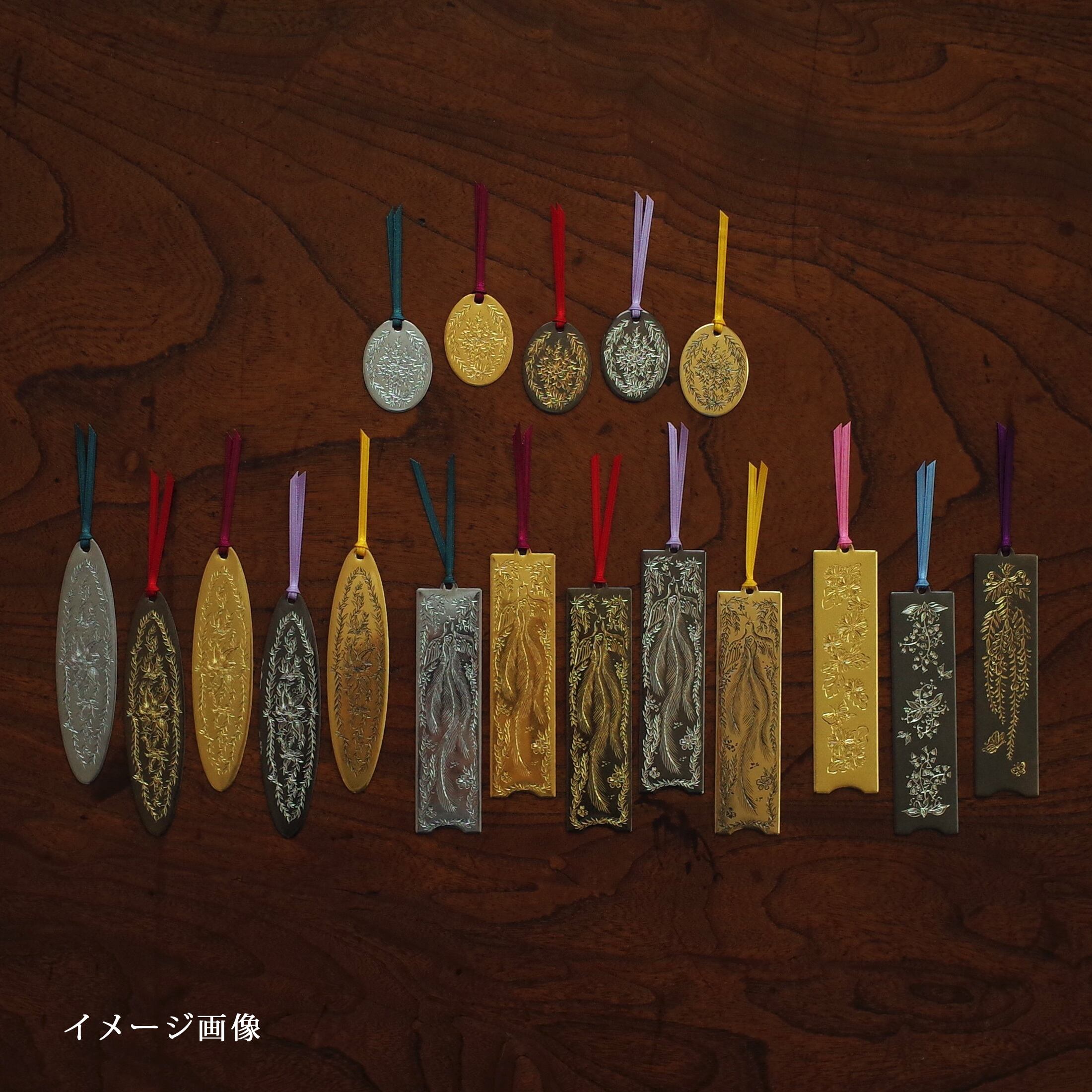 すずらんと、香りに惹き付けられ遊びに来た蝶々の絵柄の彫金しおりです。すずらんは、ヨーロッパでは春のシンボル、また幸福をもたらす花とされ、大切な人や花嫁に贈る風習があります。